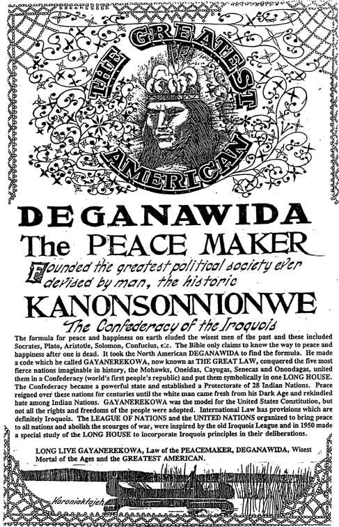 The formula for peace and happiness on earth eluded the wisest men of the past and these included Socrates, Plato, Aristotle, Solomon, Confucius, etc. The Bible only claims to know the way to peace and happiness after one is dead. It took the North American DEGANAWIDA to find the formula. He made a code which he called GAYANEREKOWA, now known as THE GREAT LAW, conquered the five most fierce nations imaginable in history, the Mohawks, Oneidas, Cayugas, Senecas and Onondagas, united them in a Confederacy (world's first people's republic) and put them symbolically in one LONG HOUSE. The Confederacy became a powerful state and established a Protectorate of 28 Indian Nations. Peace reigned over these nations for centuries until the white man came fresh from his Dark Age and rekindled hate among Indian Nations. GAYANEREKOWA was the model for the United States Constitution, but not all the rights and freedoms of the people were adopted. International Law has provisions which are definitely Iroquois. The LEAGUE OF NATIONS and the UNITED NATIONS organized to bring peace to all nations and abolish the scourges of war, were inspired by the old Iroquois League and in 1950 made a special study of the LONG HOUSE to incorporate Iroquois principles in their deliberations. LONG LIVE GAYANEREKOWA, Law of the PEACEMAKER, DEGANAWIDA, Wisest Mortal of the Ages and the GREATEST AMERICAN.MESSAGE FROM GANIENKEH |
